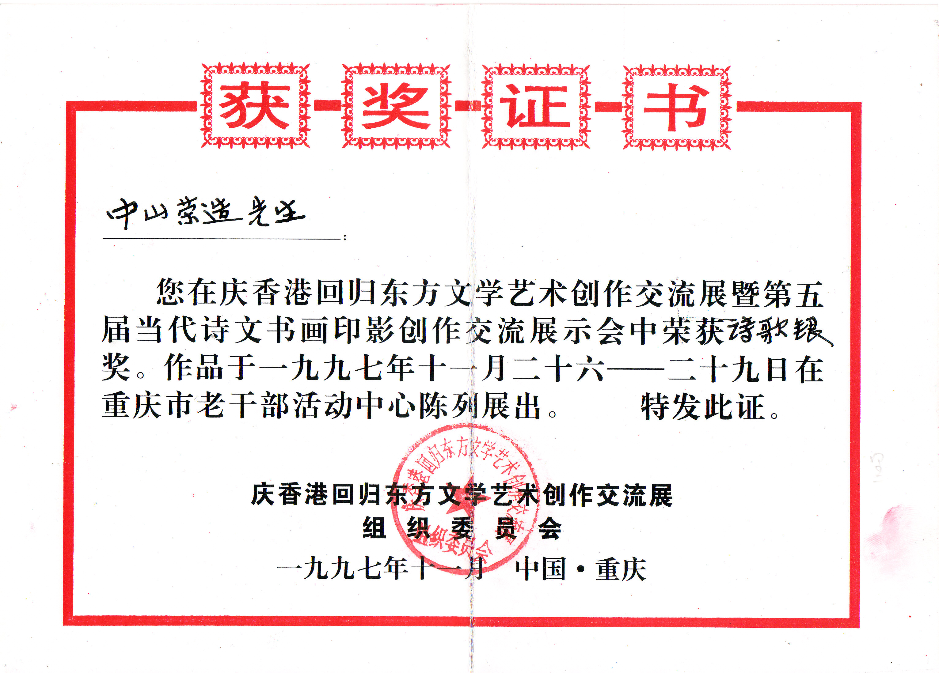 漢詩詞交流香港回帰作品銀賞受賞